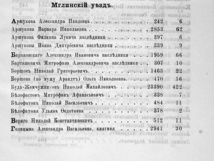 Список потомственных дворян Мглинского уезда, владевших поместьем более 100 десятин в 1900 году
